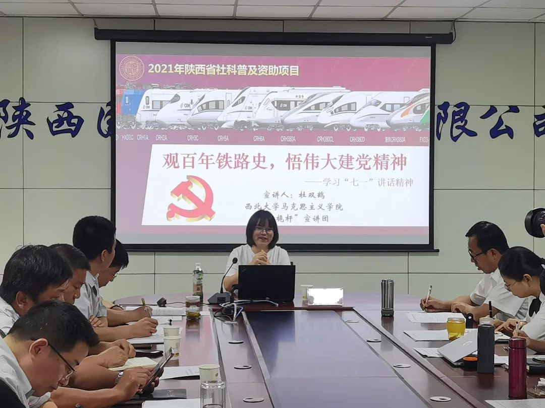 陕西国铁经营服务有限公司仝海燕老师向与会人员介绍了“红桅杆”宣讲团及三位主讲人的情况,并强调了学习“七一”重要讲话精神的重要意义。