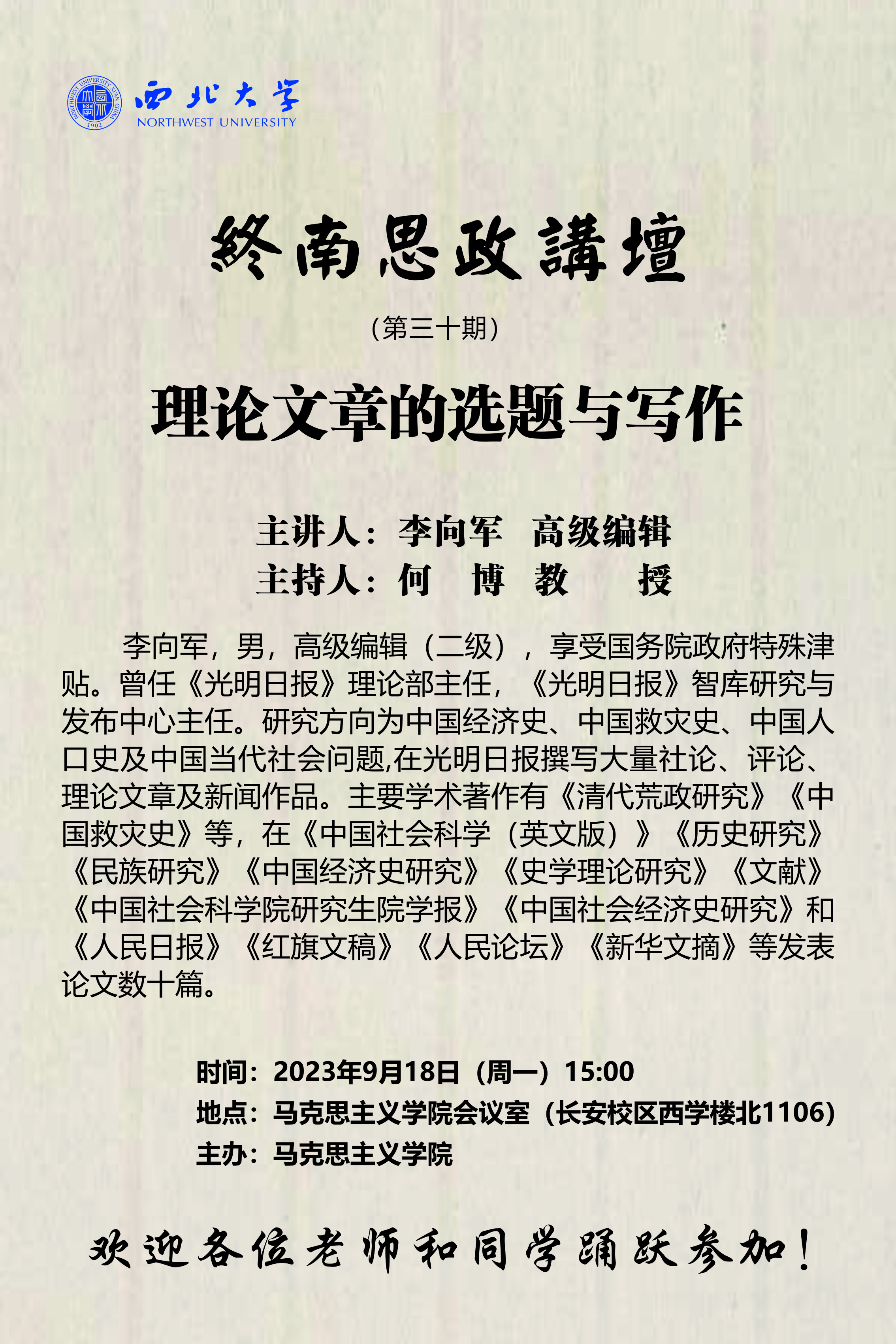 上一条:名家讲坛——学术期刊视角的选题和论文 下一条:“侯外庐学术讲座”第二百九十三讲——强化马克思主义理论研究的问题意识—兼谈论文开题和课题申报的问题导向